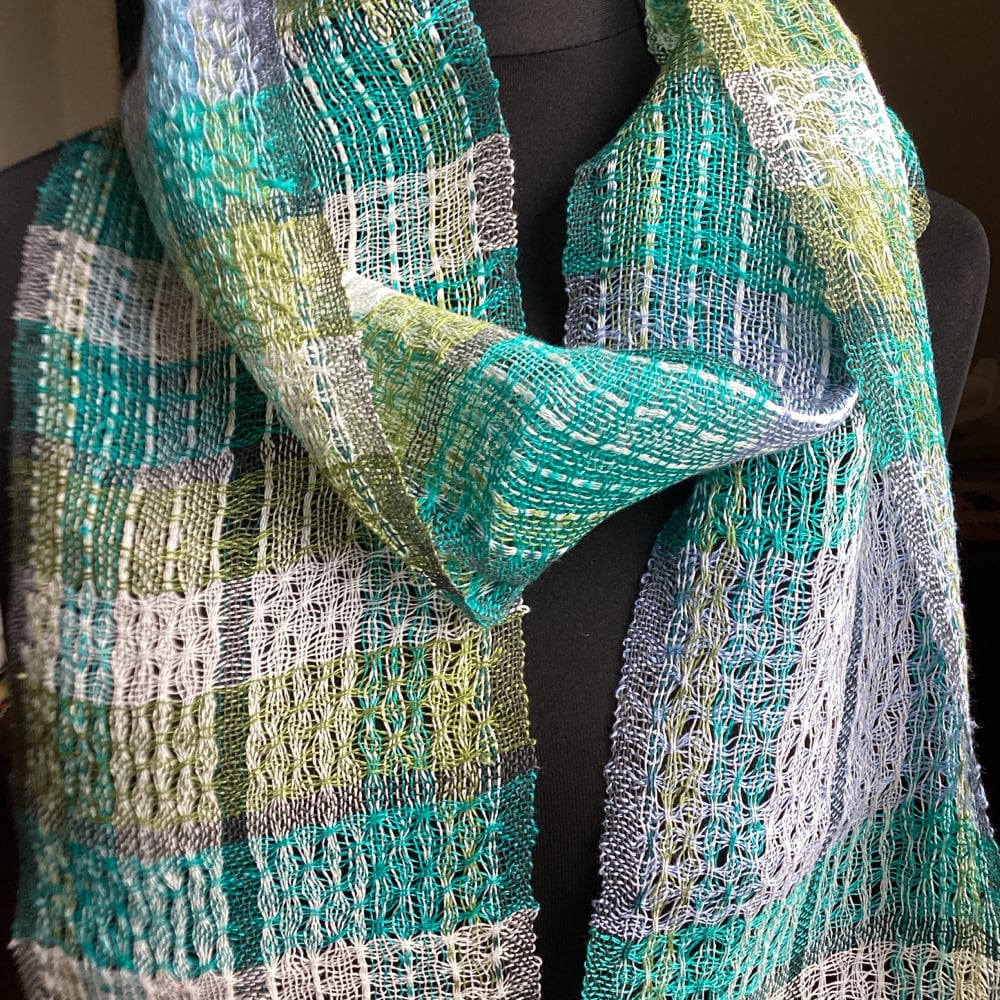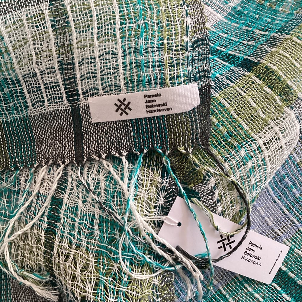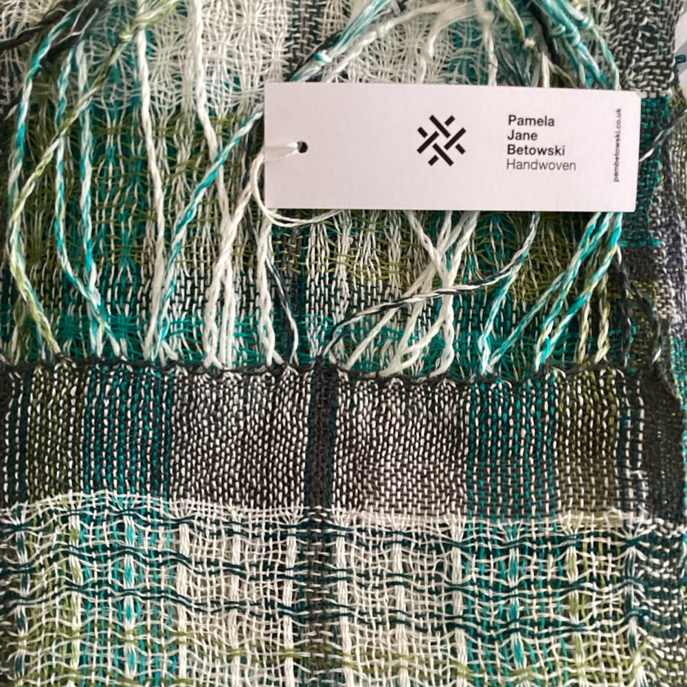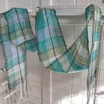 Chapel Carn Brae is a long, narrow scarf handwoven in crisp 100% linen, which will soften with repeated washing. Woven in colours of the sea, sky and mossy banks in a wavy lacy pattern. This scarf measures 209x18cm plus a twisted fringe.