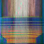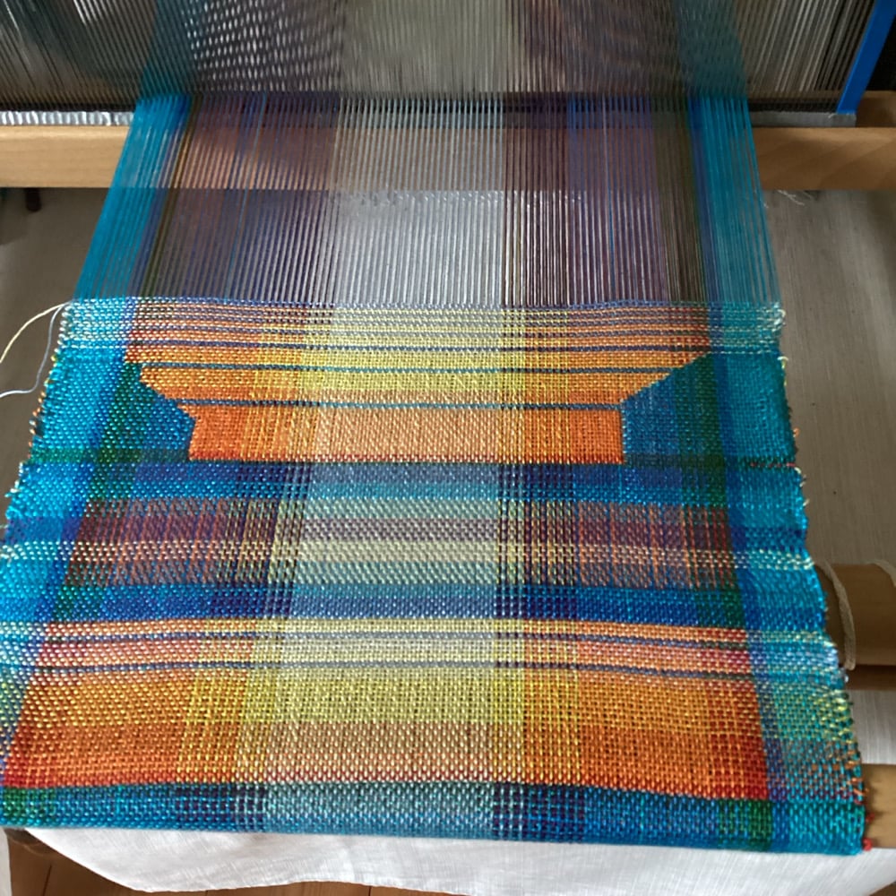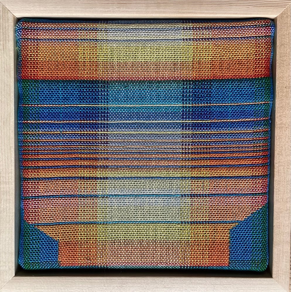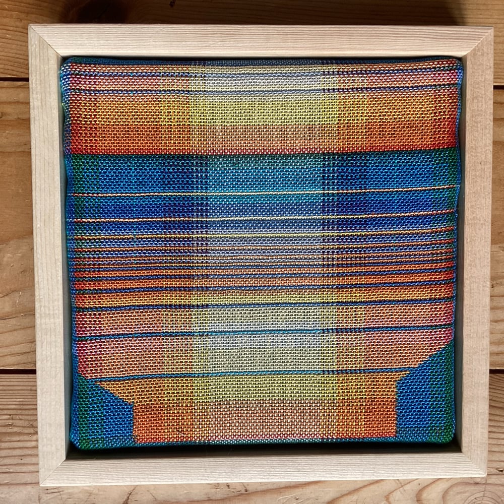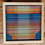 Fibonacci’s Dream 2024 is a small double weave piece. The third and fourth image show the piece in the process of being woven on the loom. After weaving this has been stretched over a canvas stretcher and framed in a simple wood box frame. 20x20cm Framed size 24x24cm.