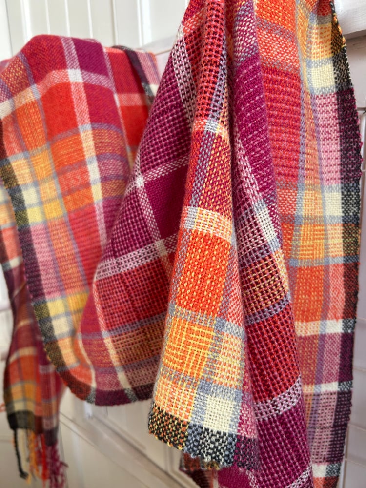 Carn Euny2 is an extra long scarf, designed then handwoven by me on my 8 shaft floor loom in my studio in West Cornwall, from luxurious soft lambswool yarn. Woven in plain weave structure with areas of log cabin. This scarf is named for the local ancient village.