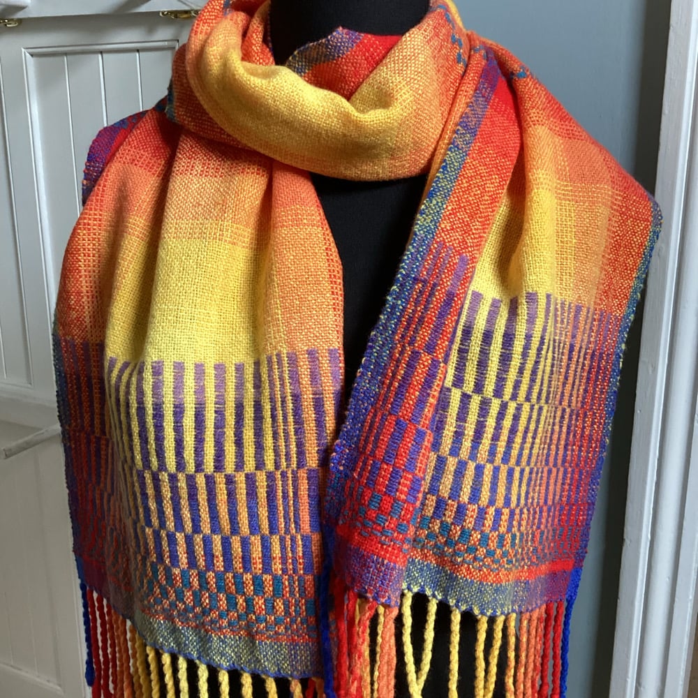 “Optic Shift” is a wearable art scarf. An individual creation designed and handwoven by me in merino lambswool. The design for this has been influenced by my wall hangings. The blocks of colour have been created using the monks belt technique. The dimensions are 182x36cm.