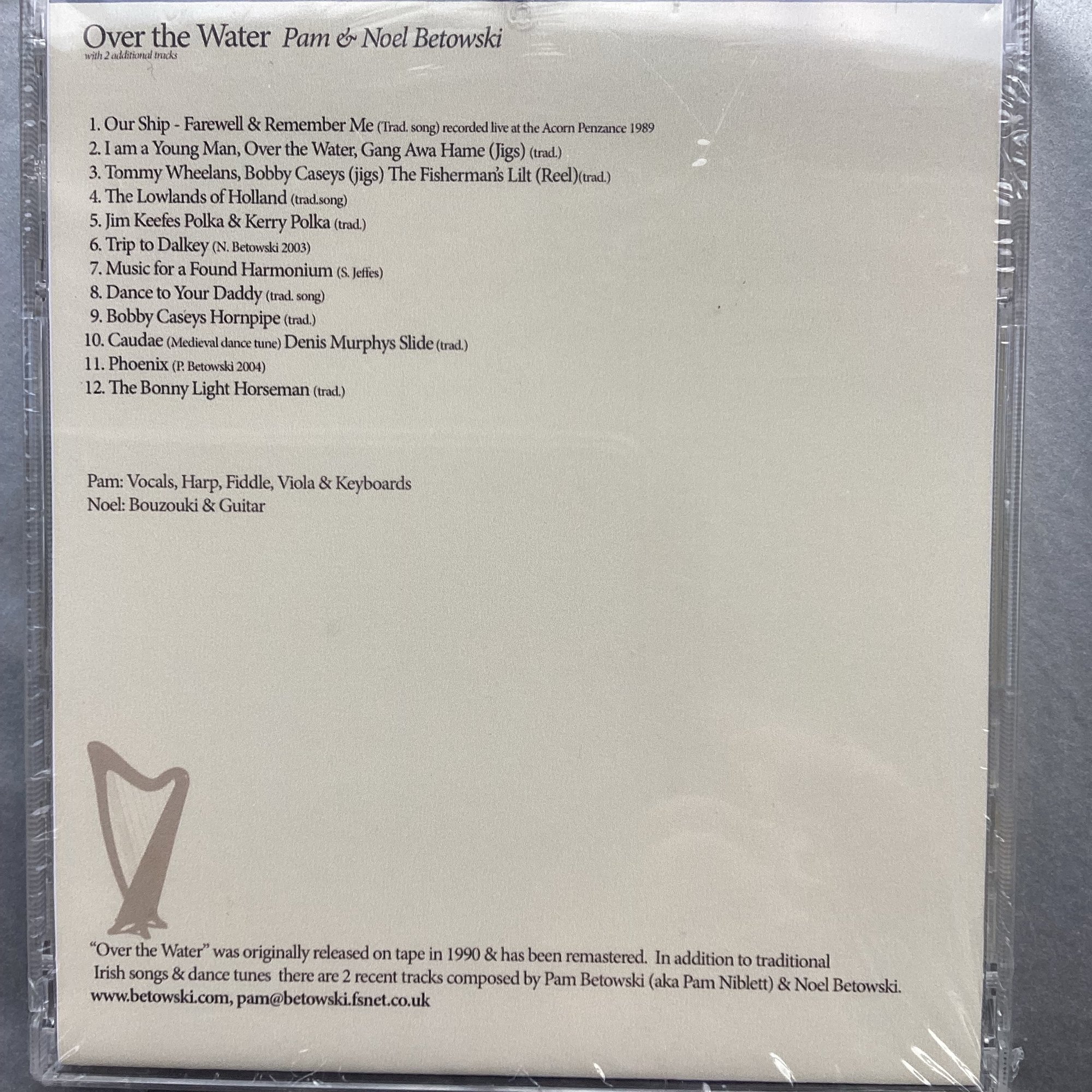 Over the Water CD presents mostly Irish Traditional dance tunes and songs on fiddle, harp and bouzouki with guitar, viola, keyboard and synth on a few tracks performed and arranged by Pam & Noel Betowski. Originally released in 1990 it has been remastered and re-released with extra tracks composed by Pam and Noel Betowski.