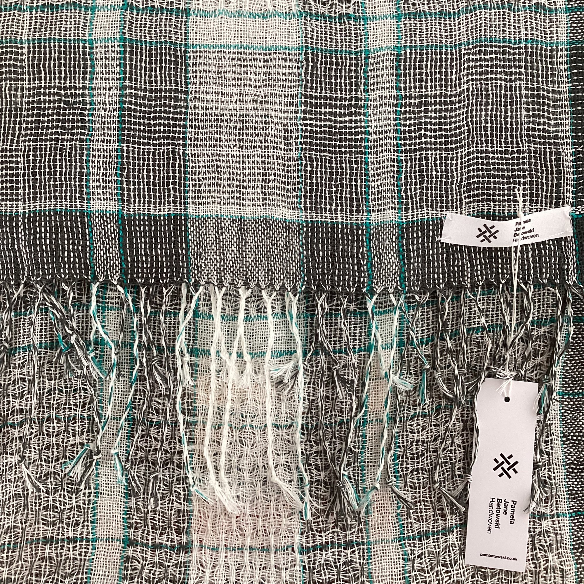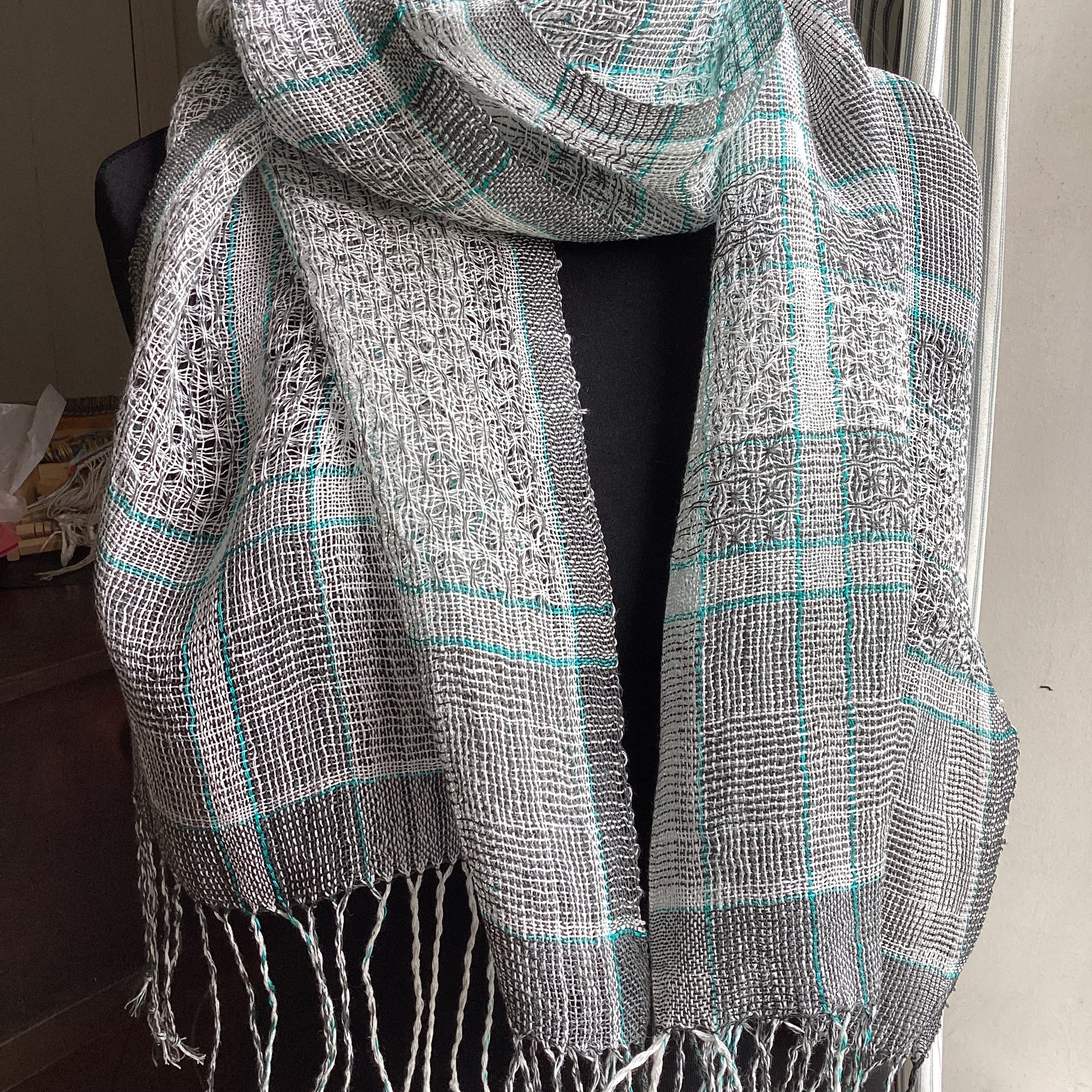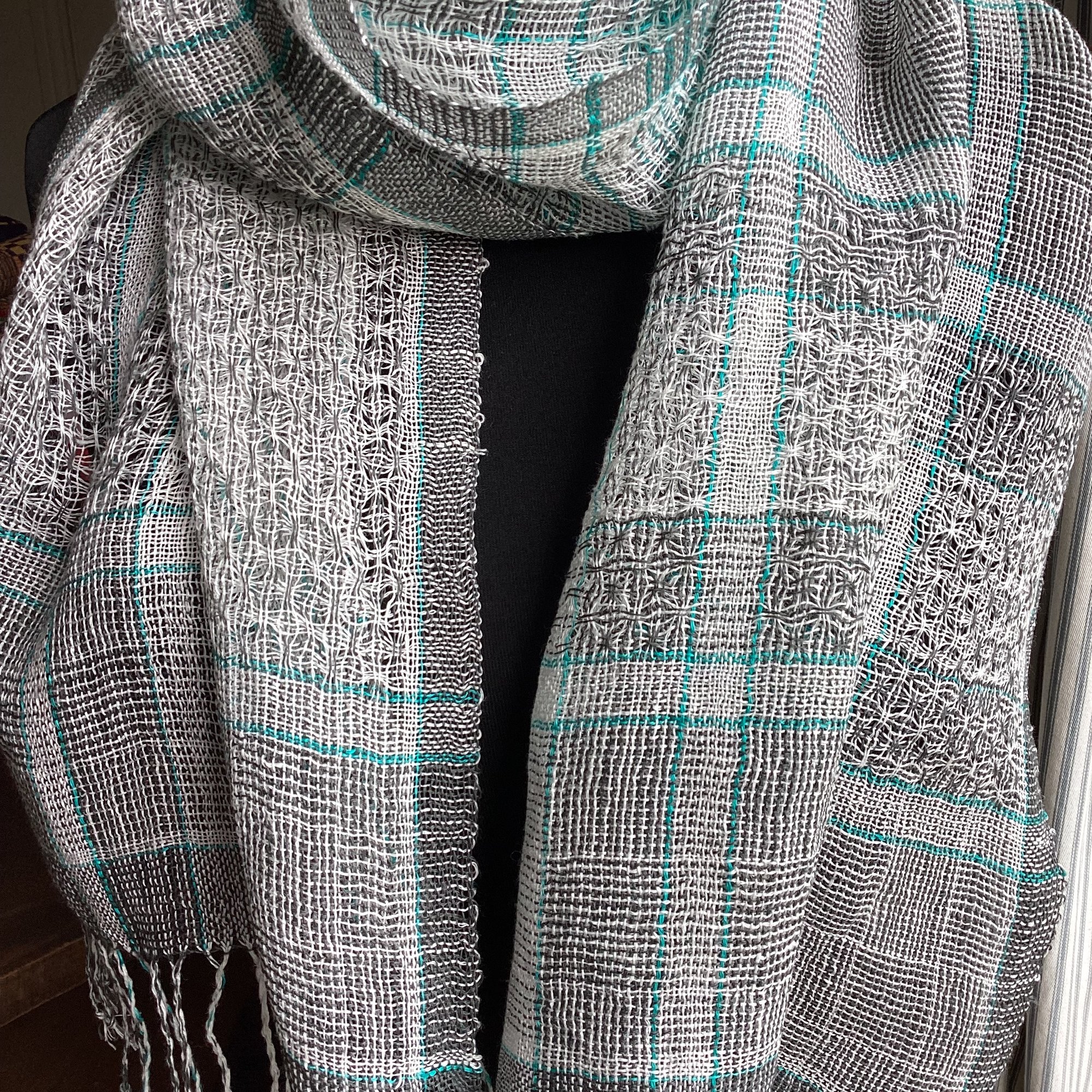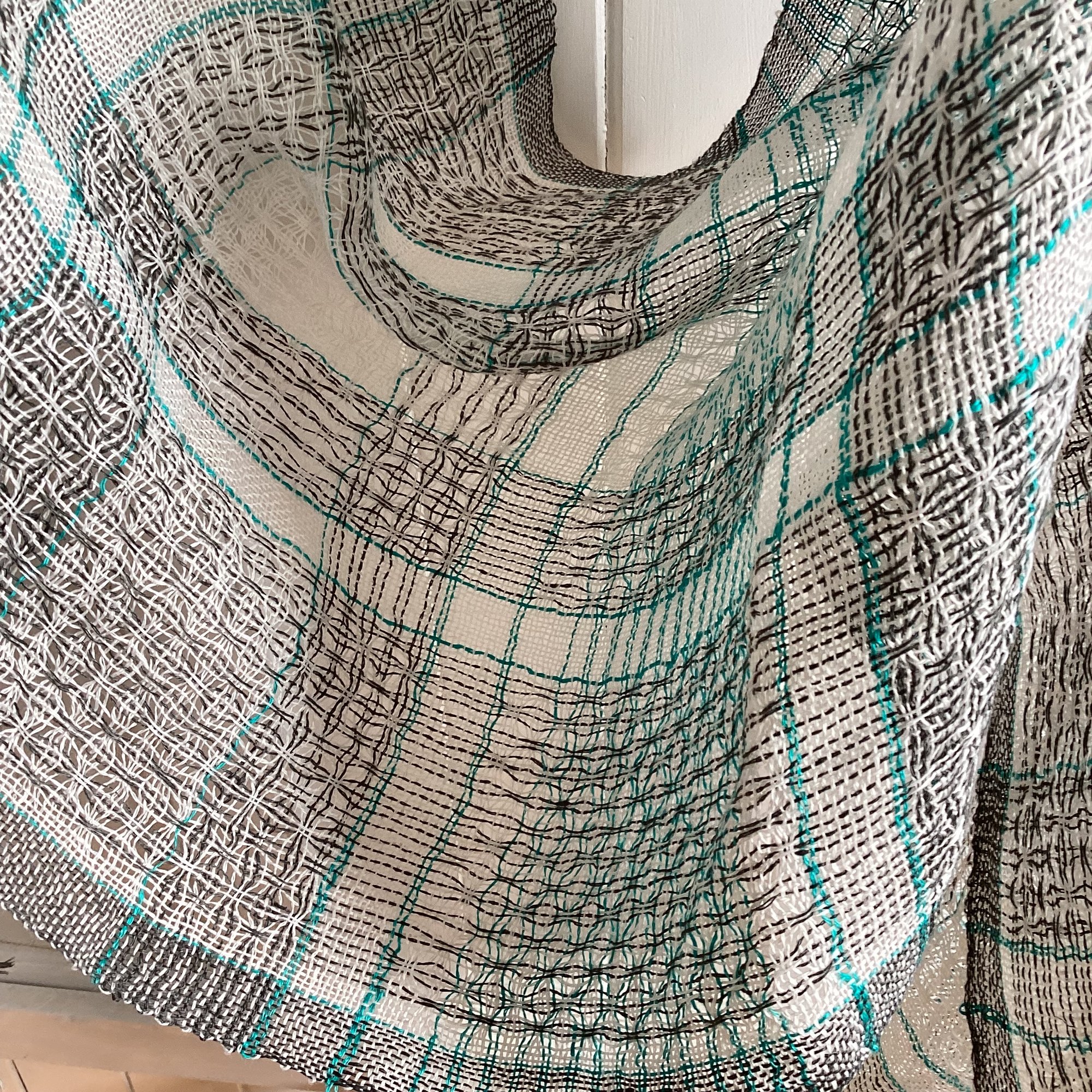 “Silver Lace” is designed and handwoven by me on my 8shaft floor loom with fine linen. Areas of huck lace and colour and weave are outlined with a beautiful azure sea blue.