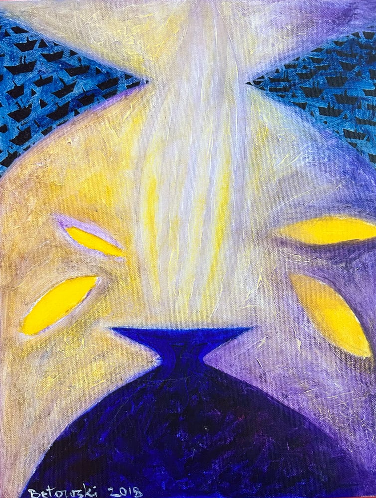 Painting by Noel Betowski “Vessel” 2018 Acrylic on canvas. 36cm x 28cm. Unframed - the sides of the deep canvas are painted.